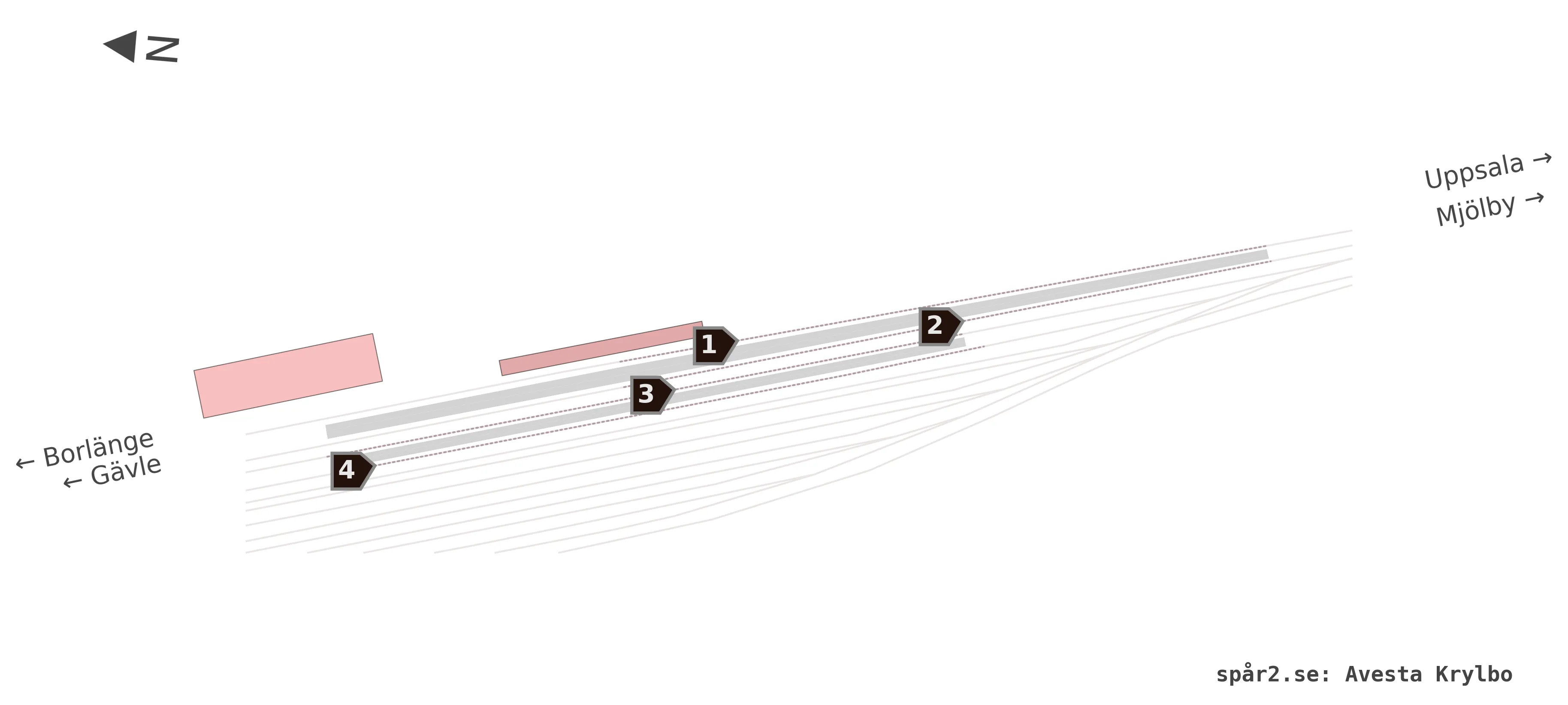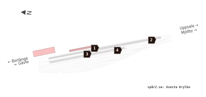 Karta över spårnummer och plattformar vid Avesta Krylbo