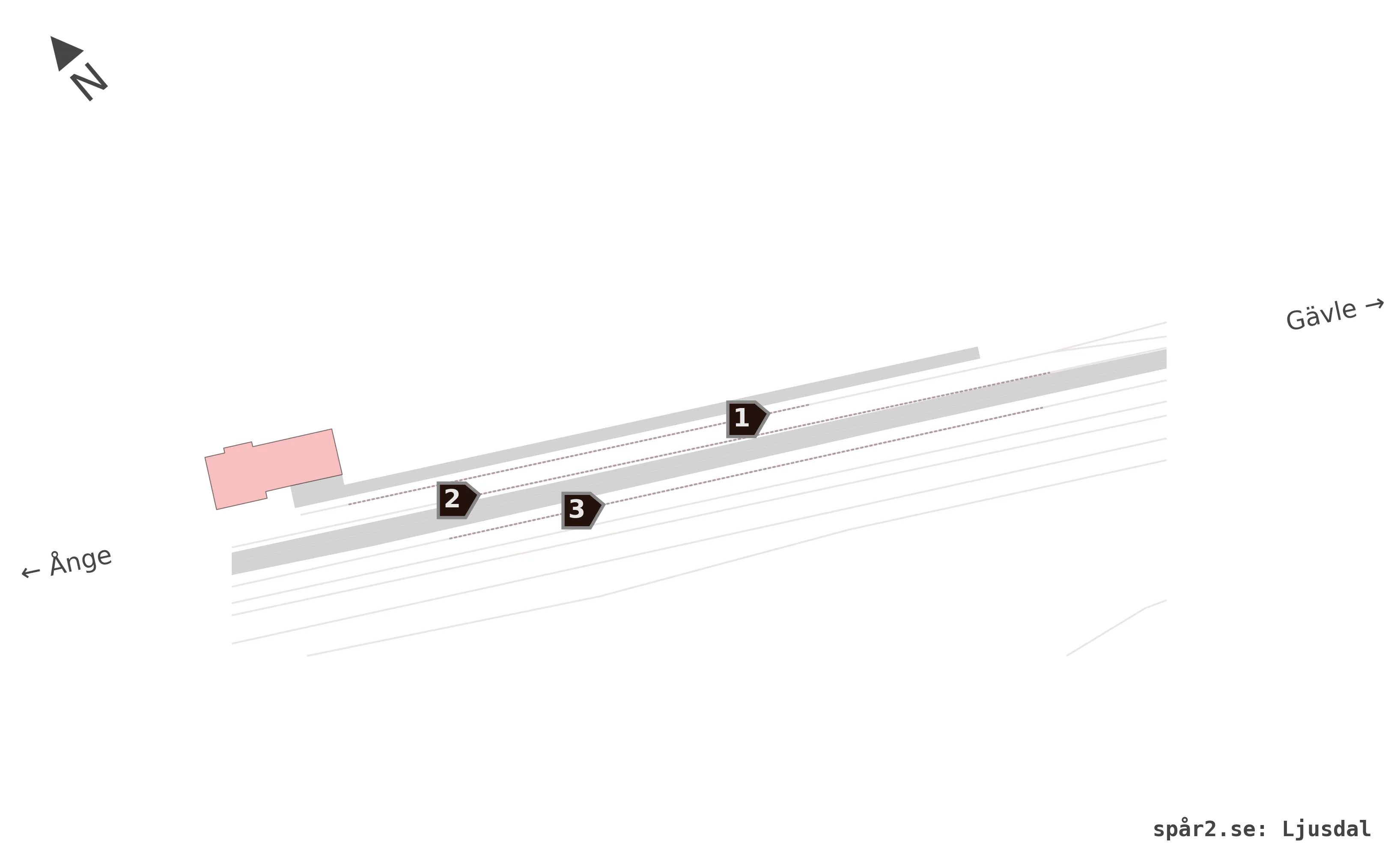 Karta över spårnummer och plattformar vid Ljusdal