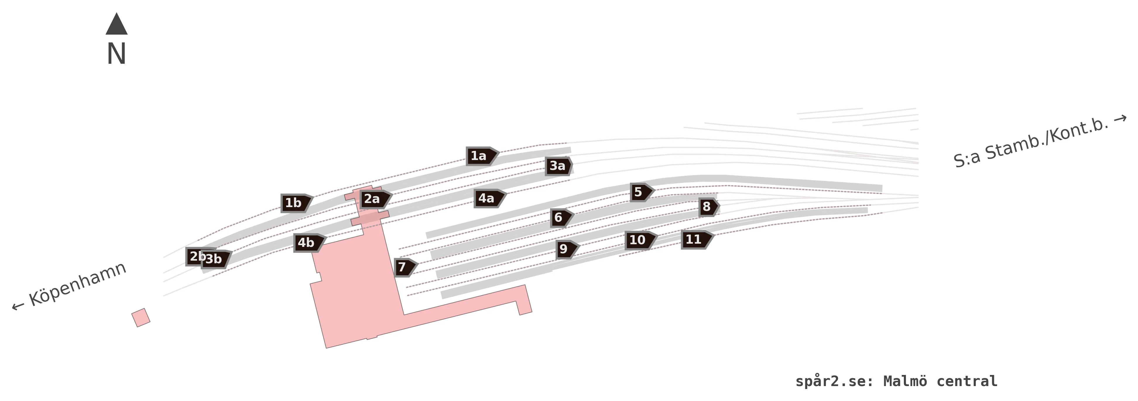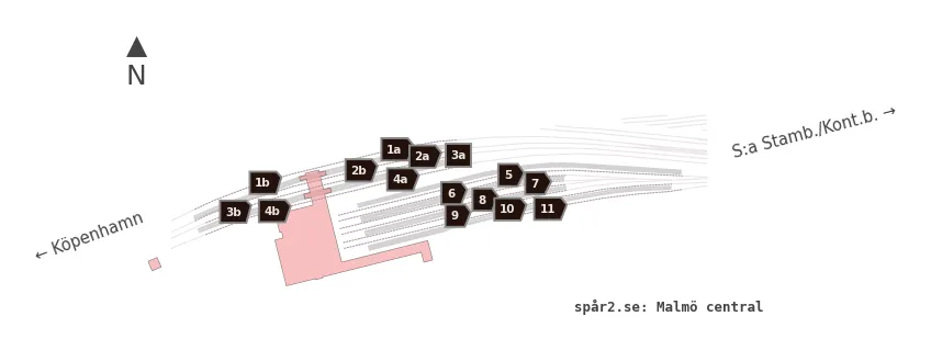 Karta över spårnummer och plattformar vid Malmö central