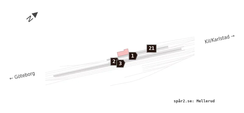 Karta över spårnummer och plattformar vid Mellerud