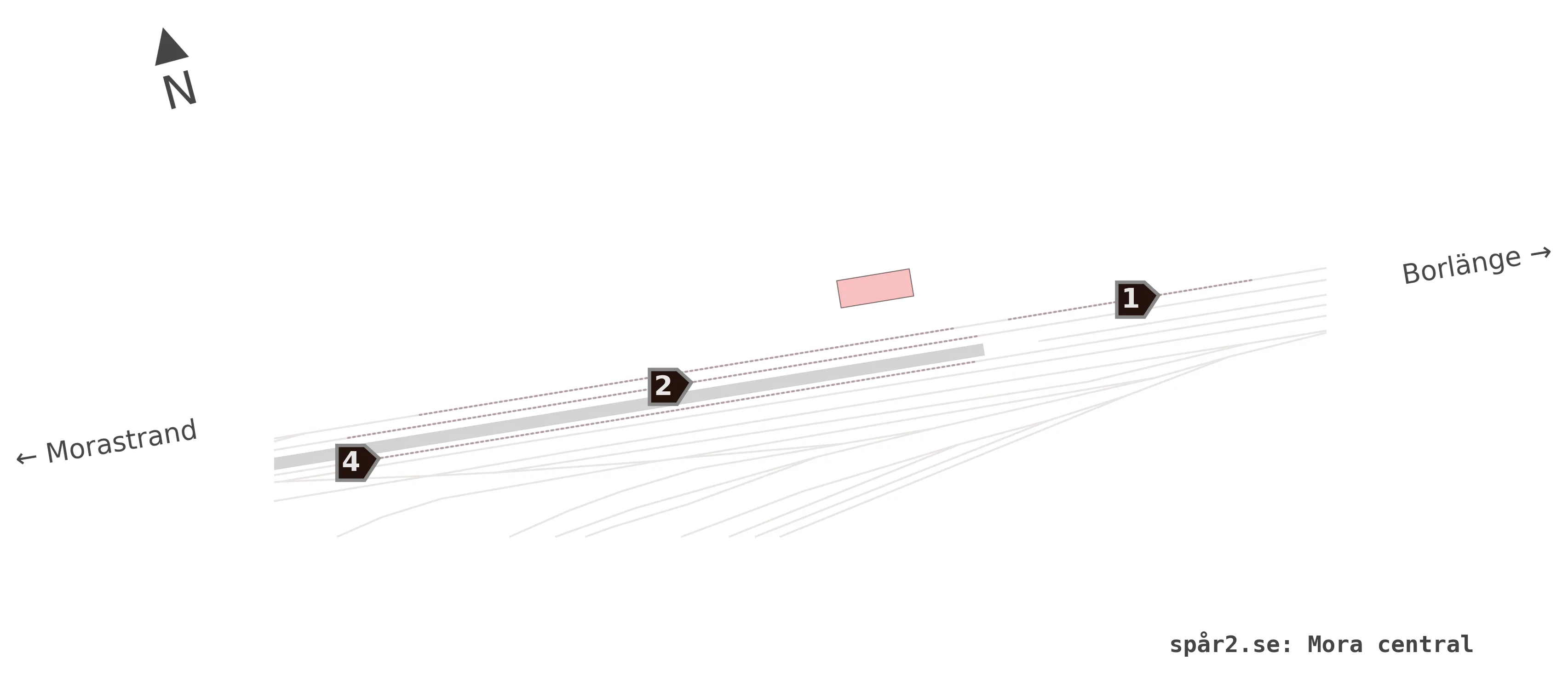 Karta över spårnummer och plattformar vid Mora central