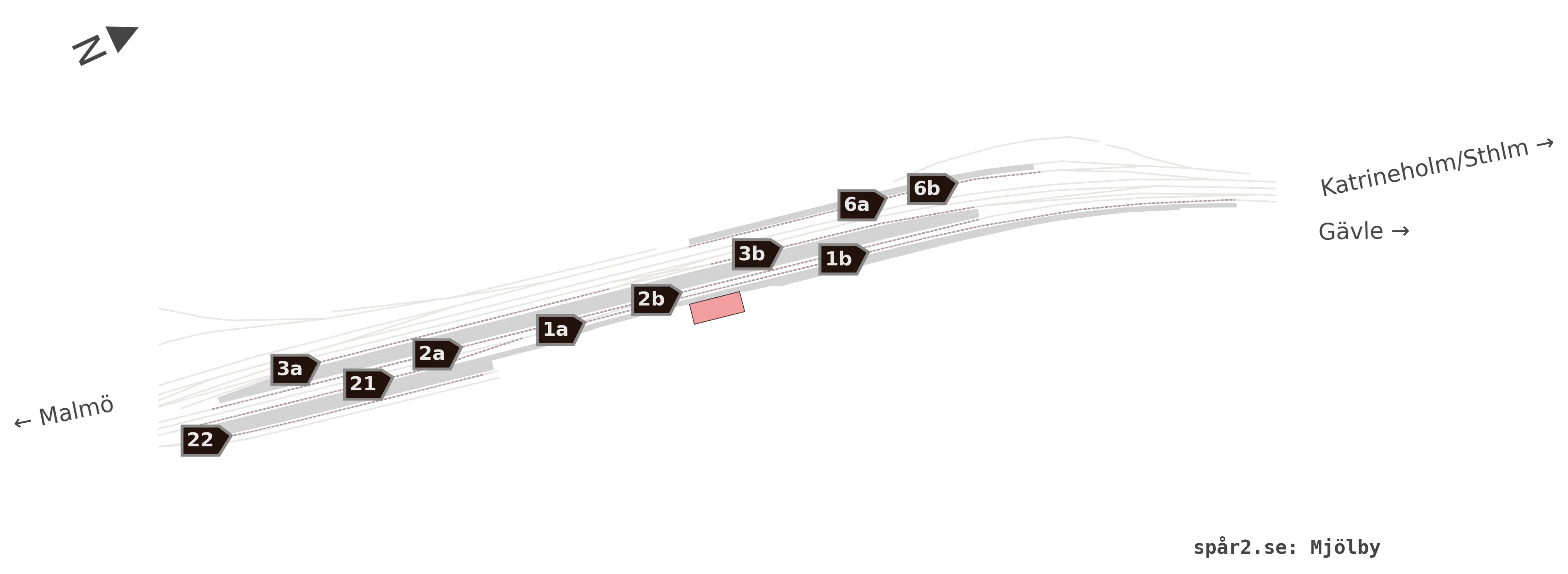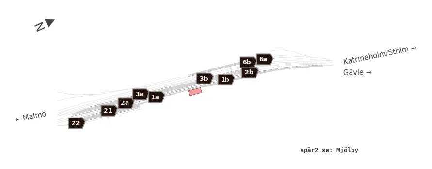 Karta över spårnummer och plattformar vid Mjölby