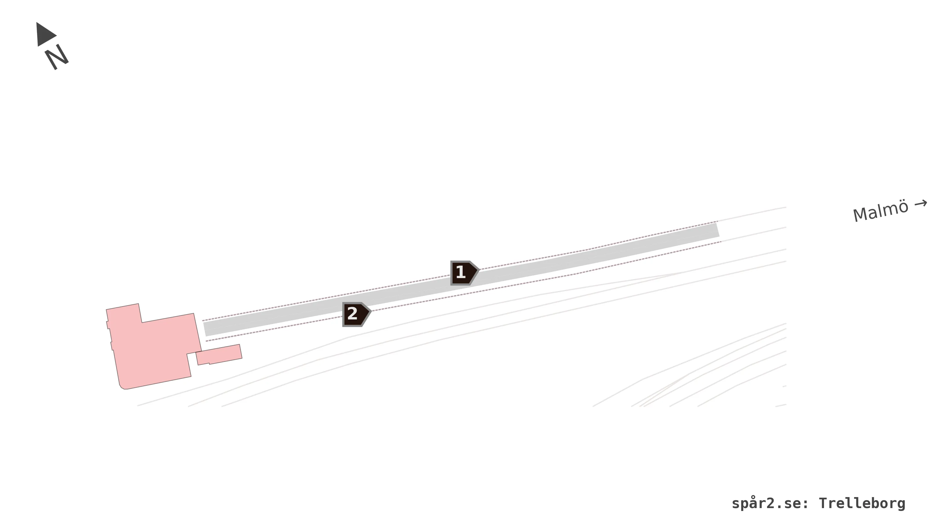 Karta över spårnummer och plattformar vid Trelleborg