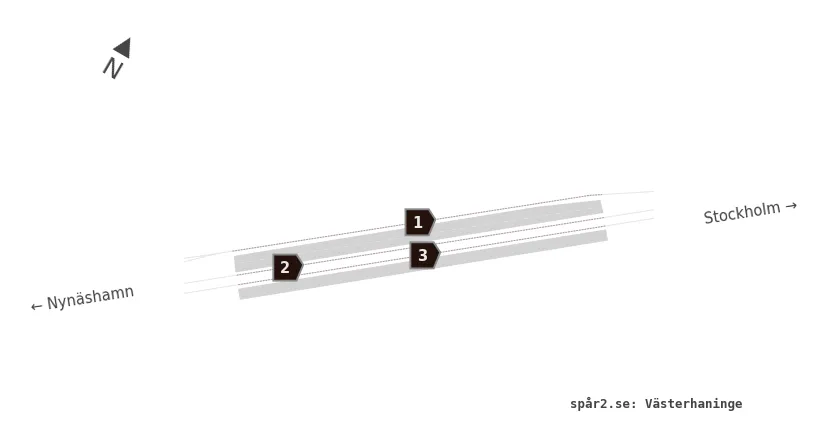 Karta över spårnummer och plattformar vid Västerhaninge